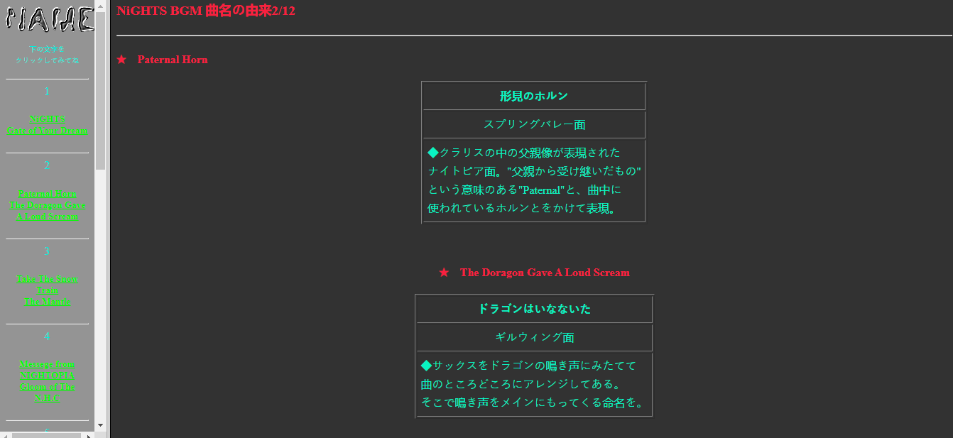 In the NiGHTS into Dreams Japanese Website, there is a section describing all of the music tracks in the game. In the description of Spring Valley's theme, Paternal Horns, it is stated that Spring Valley expresses the image of Claris's Father and the track is called "Paternal Horn" because "paternal" means fatherly, and the horn refers to the one used in the track.[1]