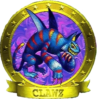 Clawz is a giant black cat with a sinister smile and yellow star on his forehead. He has yellow and red stripes on his back, legs and tail, blue paws with red claws and blue pointy wings.
