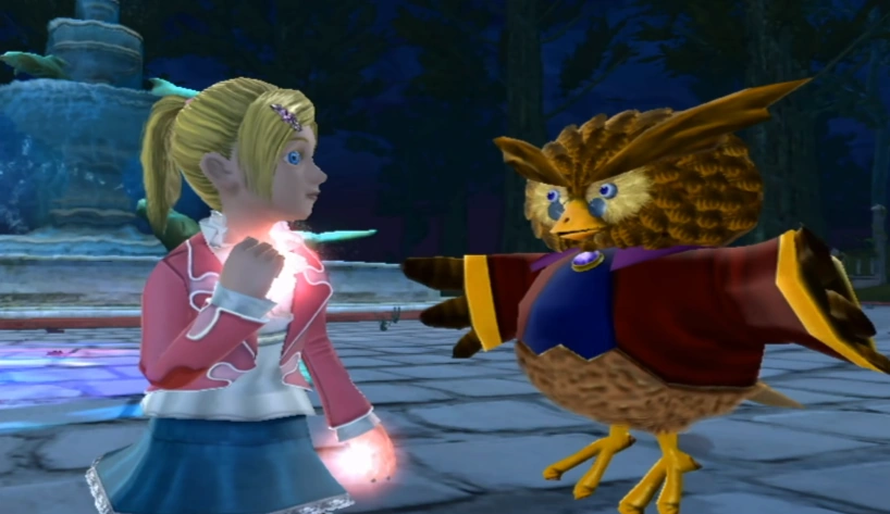 Helen then, falls into the Dream Gate, where Owl greets and introduces the Night Dimension to her. Eventually, Helen meets NiGHTS, who asks her if she'd like to fly around to have fun by dualizing with them. Helen gives a try and after flying for a while, they are surprised by a door to a Nightopia (Aqua Garden) appearing at the Dream Gate, which was created by Helen's red Ideya.