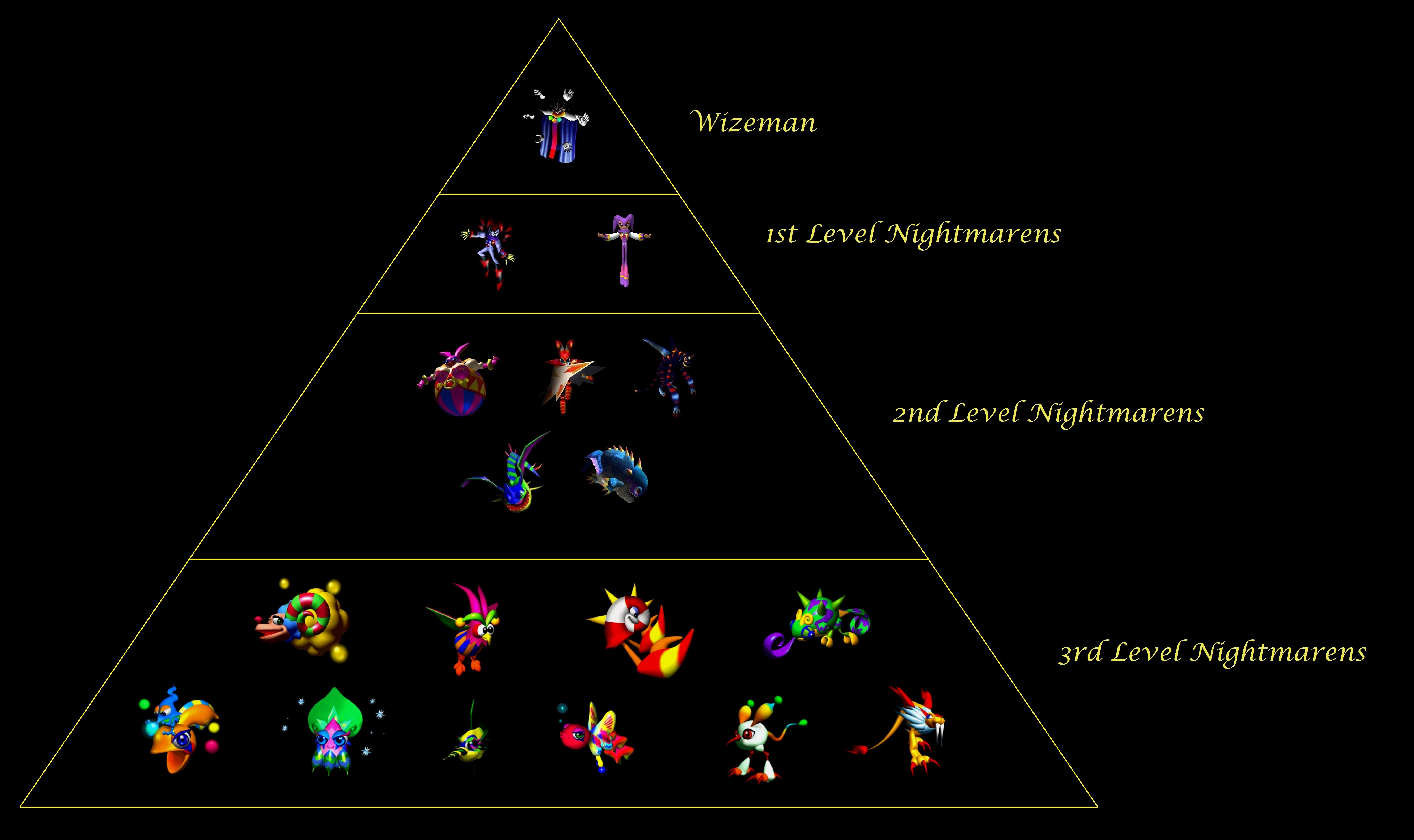 The hierarchy of the nightmarens from NiGHTS into dreams according to Nightmare's level system.